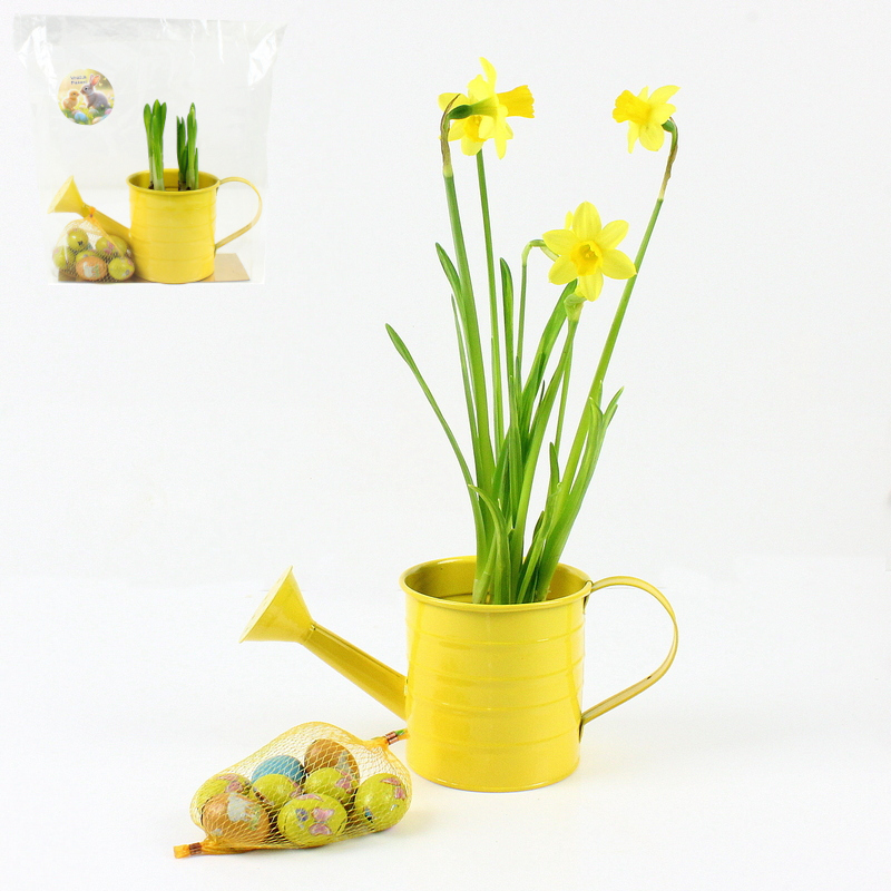 Een bloeiend paasgeschenk met een zoete verrassing. Dit sfeervolle paasgeschenk bestaat uit een geel metalen gietertje 23 x 10 x 10 cm, gevuld met Tête-à-Tête narcissen en aangevuld met een netje chocolade paaseitjes 85 gram. Een vrolijke combinatie van lente en lekkers die direct zorgt voor een echt paasgevoel. Het geheel wordt feestelijk verpakt in transparante folie, voorzien van een paassticker. Het is mogelijk om de paassticker te personaliseren, bijvoorbeeld met een logo, naam of eigen paasboodschap. Vraag naar de mogelijkheden, wij denken graag met je mee. Besteleenheid: 60 stuks. Dit artikel is alleen leverbaar met palletvervoer. Levertijd in overleg.